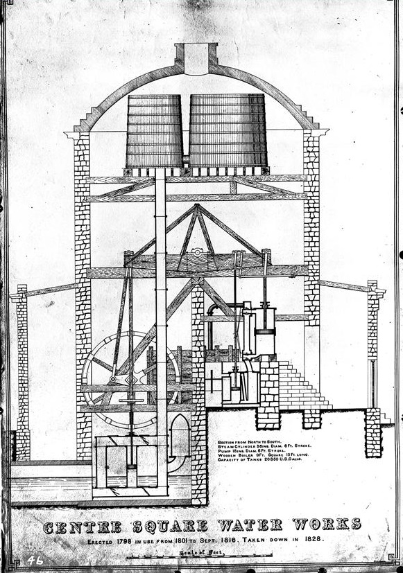 After suffering through yellow fever epidemics in 1793 and 1798, the city decided to build water works and engaged Benjamin Latrobe to design them and supervise the construction. The system began service with two steam engines and elevated tanks holding about 17,094 ale gallons at Centre Square (shown below) on January 21, 1801. Wooden logs were initially used, with many provided by Caleb Leach. A few cast iron pipes were installed in 1801 on an experimental basis, but not widely used for many years due to the high cost and limited availability. A list of wood and iron pipes installed each year from 1801 through 1854 is included in the 1875 Annual Report of the Chief Engineer.